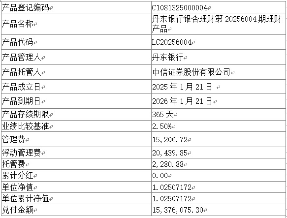 丹东银行银杏理财第20256004期理财产品到期公告