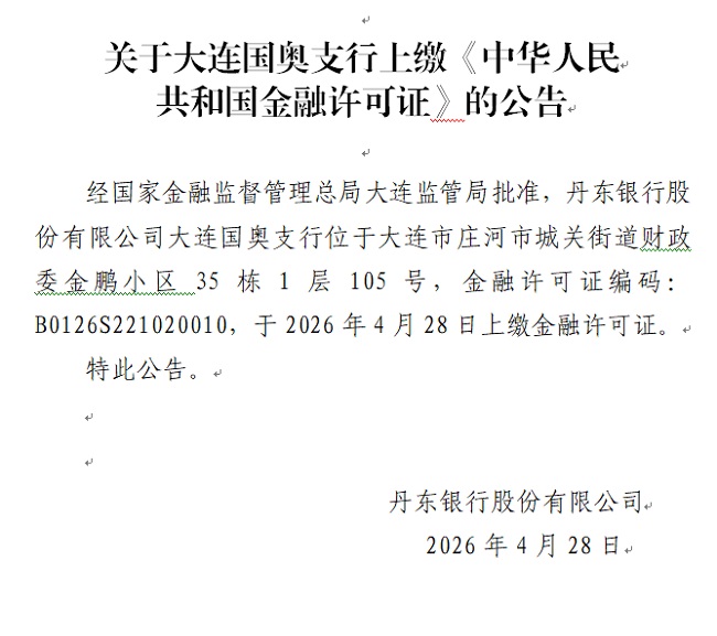 关于大连国奥支行上缴《中华人民共和国金融许可证》的公告
